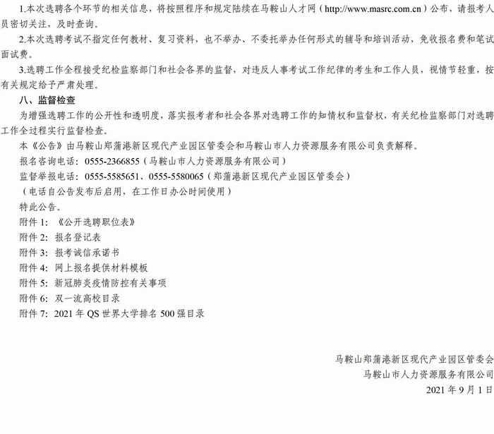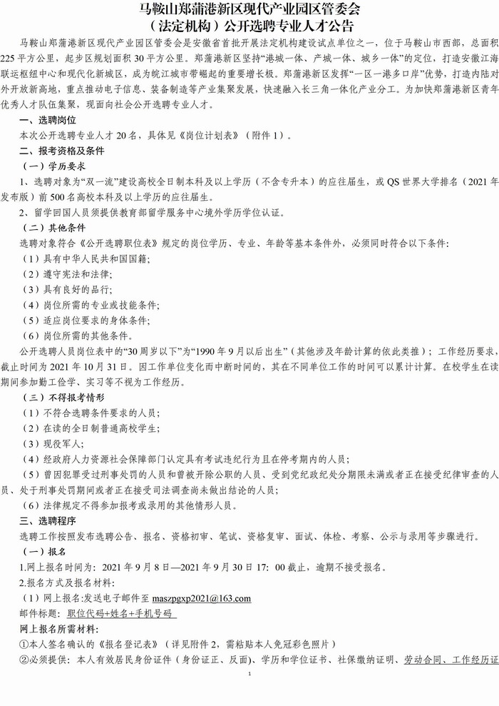 附件8:马鞍山郑蒲港新区现代产业园区管委会(法定机构)公开选聘专业人才公告