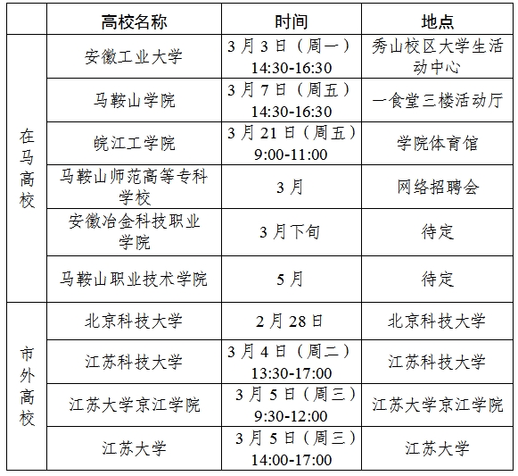 为促进高校毕业生留马(来马)就业,满足我市招才引智需求,拓宽用人单位引才渠道,优化企业营商环境。马鞍山市人才综合服务中心将联合安徽工业大学等在马高校,及北京科技大学等部分市外高校分别开展2025年春季马鞍山市“才聚诗城高校行”系列招聘活动,具体安排如下: